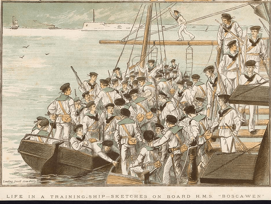 To be taken on as a Boy in the Royal Navy needed the agreement of his legal Guardians, so his Father, no doubt quite relived to be getting shot of him to somewhere other than the Police or the Workhouse, signed him up for training as a Boy Sailor to be followed by 12 years in the Naval Service. Off Charles went to Portland in Dorset on the South Coast to be trained aboard HMS Boscawen the Royal Navy’s Boys Training Establishment, Boscawen at this date was actually the former HMS Trafalgar.