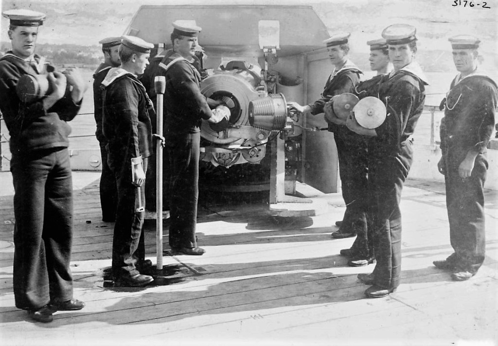 Charles seems to be enjoying the life at sea, and receives a Good Conduct citation in December 1903, and stays aboard Ariadne until 10th April 1904. But Charles being Charles, he then receives 90 days hard labour for “breaking out of ship etc”. The picture below is of a Gun Crew on Ariadne in 1903, when Charles was on board, can’t help thinking that the bloke second from right fits the description?