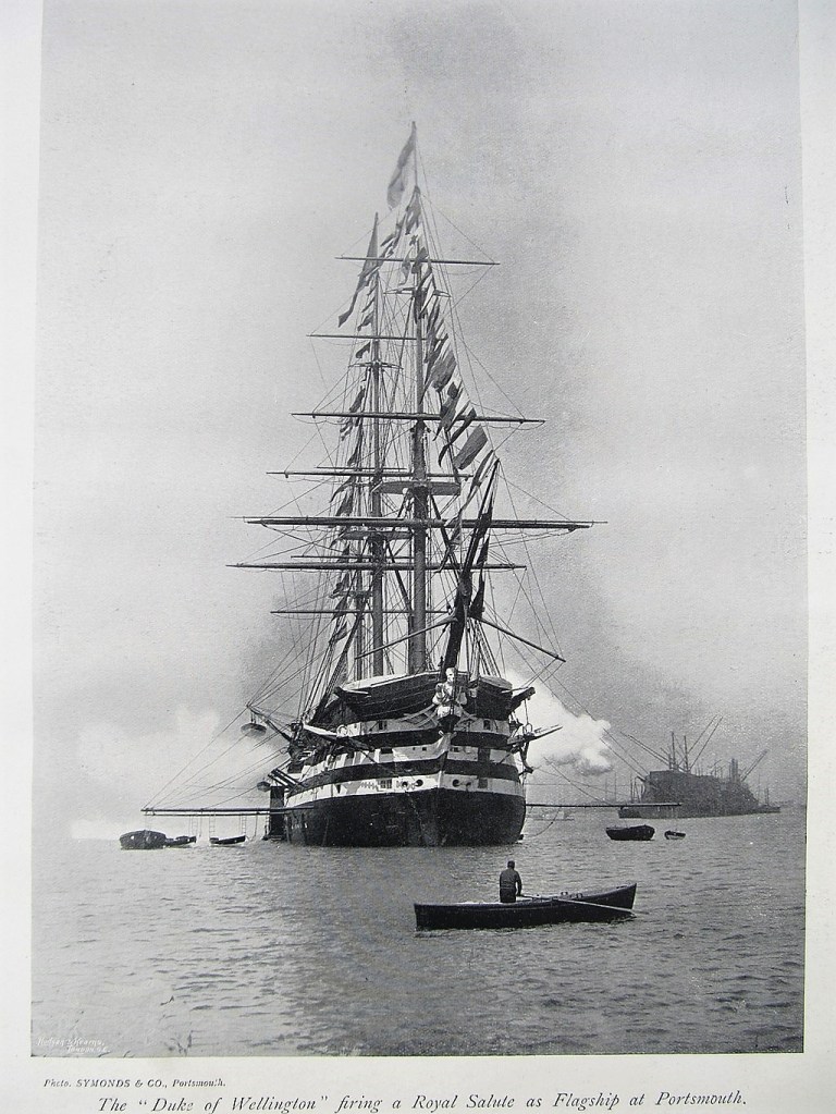 After two months of Hard Labour Charles was back aboard HMS Duke of Wellington in June 1902. The Duke of Wellington (below) was the Admiral’s Flagship in Portsmouth Harbour, and tended to perform ceremonial duties like firing gun salutes to passing dignitaries and foreign ships etc. It seems that his erratic record did not inhibit Charles’ opportunity for fairly comfortable postings.