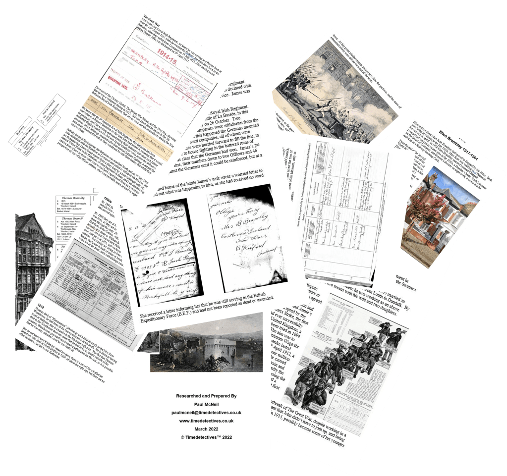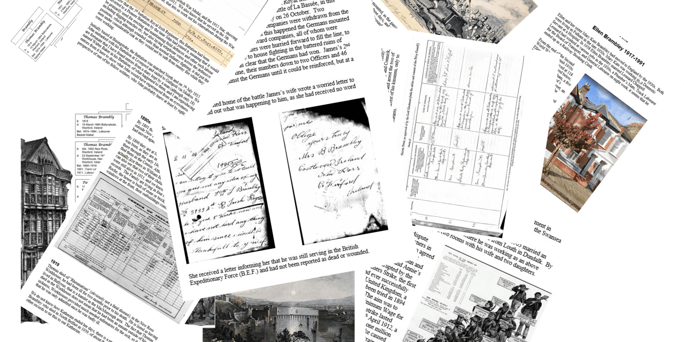 Always nice to get a Family Story finished, Ireland, Wales, England, Wars, pigs running lose, women writing to Regiments about husbands missing in action, split loyalties, and Wild Geese fleeing home to a dark place where Canaries are more usual, and families rallying round. Irish Trees can be problematic due to the lack of records compared to the UK, but they still have gems to offer up.