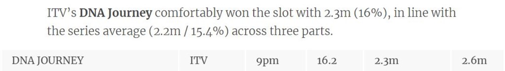Great figures for DNA Journey again in the overnights 2.6 million viewers maximum taking first place in the 9 o’clock slot.