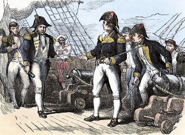 Interestingly, the British boarding party kept to the letter of the law under their warrant, and took the four deserters that were named in their warrant as being onboard. This was despite the fact that scores of British Nationals were part of the crew of the Chesapeake, and the American Captain surrendered his command (pictured below). So having precisely exercised their warrant and taken the named deserters they had come for, the British party returned the Chesapeake to the control of its Captain and rowed back to HMS Leopard.