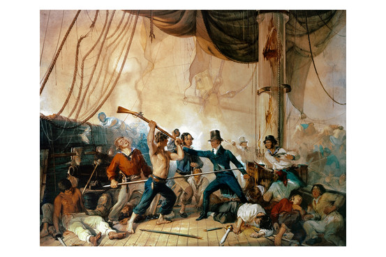 The fighting initially started to die down with the American Crew holed up on the lower decks, until a random American sailor inadvisably, shot up through a hatch and killed a British Sailor, at which the other British sailors poked their pistols and muskets through the hatch and started blasting away at the Americans below. A British Officer restored order, by threatening to “blow the brains out” of the next man who fired a shot, and then ordered the Americans to send up the man who had fired the initial shot and then disingenuously warned the Americans below decks that “We have three hundred men aboard. If there is another act of hostility you will be called up on deck one by one – and shot.” His actions calmed things down on both sides.