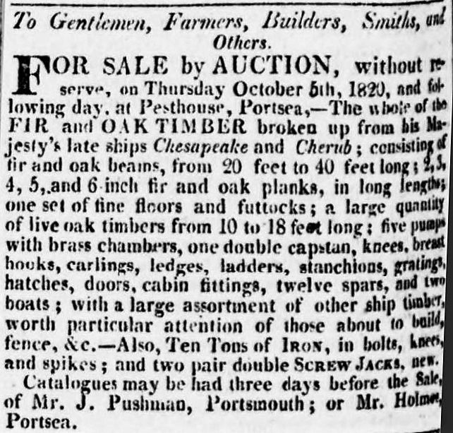 Finally HMS Chesapeake was decommissioned in 1819 at the close of the Napoleonic Wars, and sold to a Mr Holmes of Portsea for £500 (perhaps the equivalent of £400,000 in today’s relative wealth), Holmes broke up the vessel to salvage several tons of valuable Copper from her, and put the rest up for sale by auction.