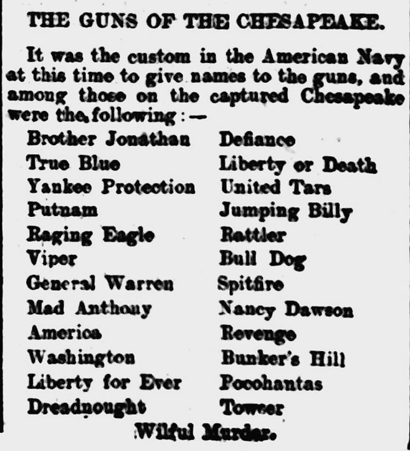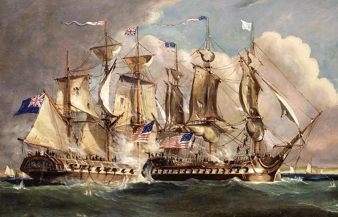 “As the Chesapeake appears now ready for sea, I request you will do me the favour to meet the Shannon with her, ship to ship, to try the fortune of our respective flags. The Shannon mounts twenty-four guns upon her broadside and one light boat-gun; 18 pounders upon her maindeck, and 32-pounder carronades upon her quarterdeck and forecastle; and is manned with a complement of 300 men and boys, beside thirty seamen, boys, and passengers, who were taken out of recaptured vessels lately. I entreat you, sir, not to imagine that I am urged by mere personal vanity to the wish of meeting the Chesapeake, or that I depend only upon your personal ambition for your acceding to this invitation. We have both noble motives. You will feel it as a compliment if I say that the result of our meeting may be the most grateful service I can render to my country; and I doubt not that you, equally confident of success, will feel convinced that it is only by repeated triumphs in even combats that your little navy can now hope to console your country for the loss of that trade it can no longer protect. Favour me with a speedy reply. We are short of provisions and water, and cannot stay long here.” — Philip Broke