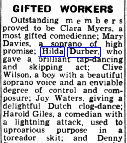 Going back to 1942 we find Hilda called out in a local Newspaper as an outstanding performer at a Wartime Concert in a “Midlands War Factory” performing a brilliant Tap Dancing and Skipping act, among a list of a Comedienne and a Comedian, a Boy Soprano, a Clog Dancer, and Margaret Danso described in one report as a “a charming dusky crooner”. Margaret had been living in Glasgow and was probably the daughter of a West African Seaman. Margaret had been a professional singer but gave her reasons for going into War Work: ” My father, a seaman was torpedoed last June and we have not heard anything since. We do not know whether he is alive. So I came here to get a hit back at the murderers.” So Hilda Durber and a group of former professional performers were now keeping morale up on the home front and doing War Work in a Factory.