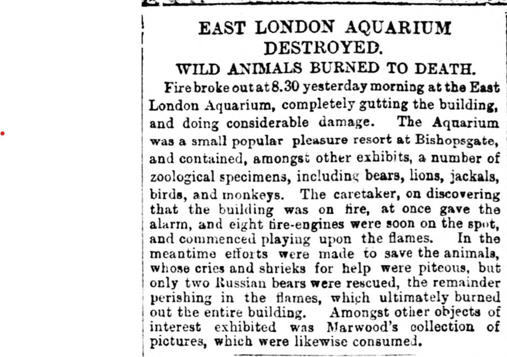 I did look to see if I could find references for Alec as a Lion Tamer, but nothing added up. I thought that perhaps he had taken over from Hezekiah at The East London Aquarium, but Hezekiah does seem to have been the last Lion Tamer there, and even once was billed under his ring name of Ching “Hooke” in this case. But after a scandal involving a large court case concerning cruelty to animals, the East London Aquarium went into receivership, before “mysteriously” burning down in June 1884, so there was no real opportunity for Alec to have become involved.