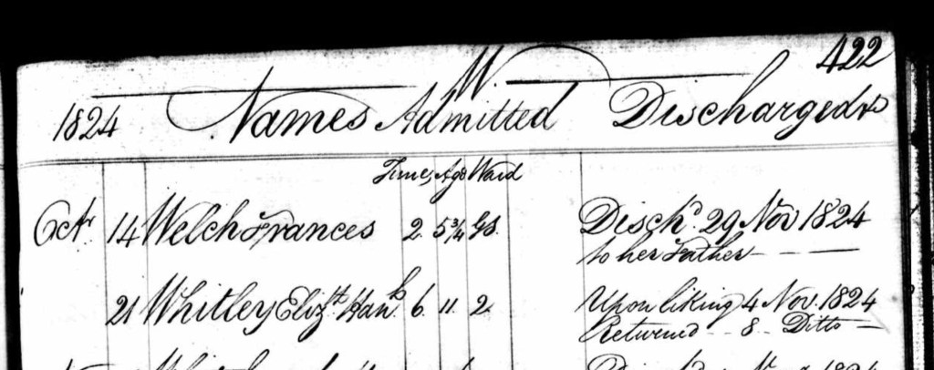 The entry below is telling as it shows her being Discharged “Upon liking” on the 4th November, “Upon Liking” means through her own choice, so she wasn’t discharged by the Workhouse staff, nor taken out by a parent, she merely requested to leave and was allowed to walk out onto the cold harsh streets of Georgian London, from where she’d appeared a couple of weeks before. We don’t know what happened in the few days after this, but she was back in the workhouse on the 8th of November 1824.