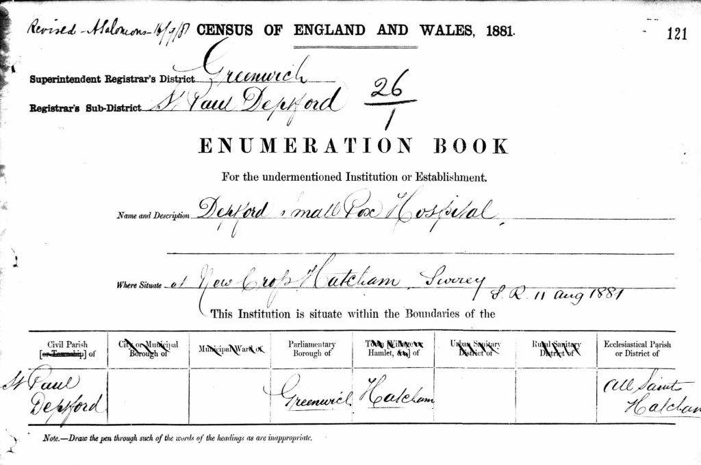 Having been running the business from 7 Star Yard for well over half a century, it fell on Sarah to be faced with hard times, there was a fire at the Yard in the late 1870s, in 1880 her son Benjamin was accused of being involved in the theft of a horse and cart from Essex but was found not guilty. In 1881 Sugar was struck down with Smallpox and admitted to the Deptford Small Pox Hospital across The River (The Thames is always referred to as “The River”) on the “Surrey Side” in what would now be South East London. As referred to by the the enumeration title page from the 1881 census below.