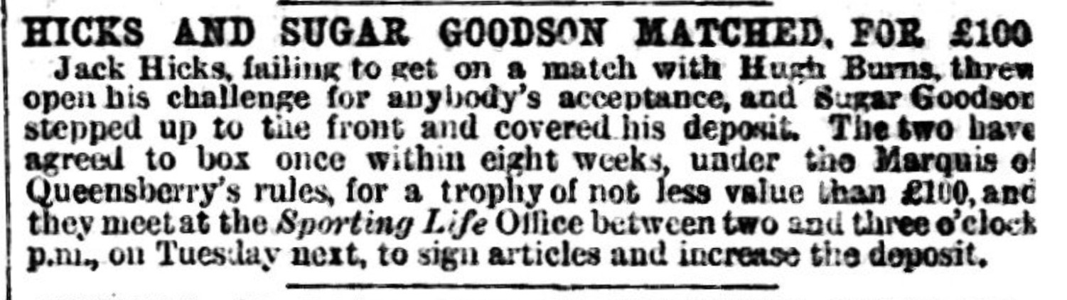 Sugar was trained and brought to fitness at the Wakes Arms Inn Epping by his old mentor Denny Harrington, as the fight was initially planned to go ahead in Epping. Sugar was 25 years of age and relatively inexperienced in formal Queensberry bouts, but had ample experience from the rougher end of the market. Sugar sttod at 5ft 5and 3/4 inches, and weighed 11 stone (154lbs). His opponent Jack Hicks was 50 years old (!), was the same height as Sugar, but was 10 st 2 lbs (142 lbs).