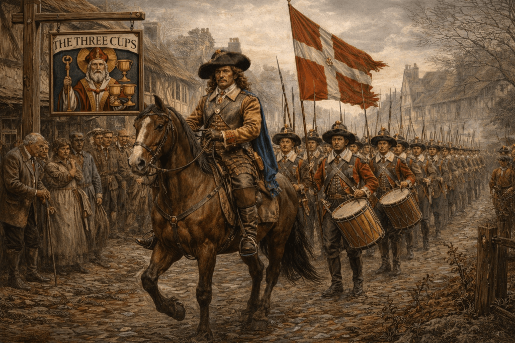 For the people of Stockbridge, the English Civil War was not a distant clash of kings and parliaments — it was something that arrived on horseback, clattered across the bridge, and demanded ale, beds, fodder, and obedience. The Wigge Family lived through a decade in which the Test Valley became a military corridor. Troops marched between Winchester and Salisbury, scouts rode ahead of them, and wagons groaned under the weight of munitions and supplies. Every one of them passed the doors of the Three Cups Inn.