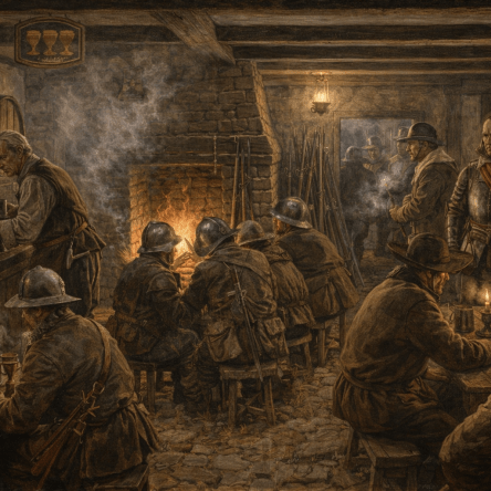 Inside, the taproom was crowded with Parliamentarian soldiers “Roundheads” stamping mud from their boots.