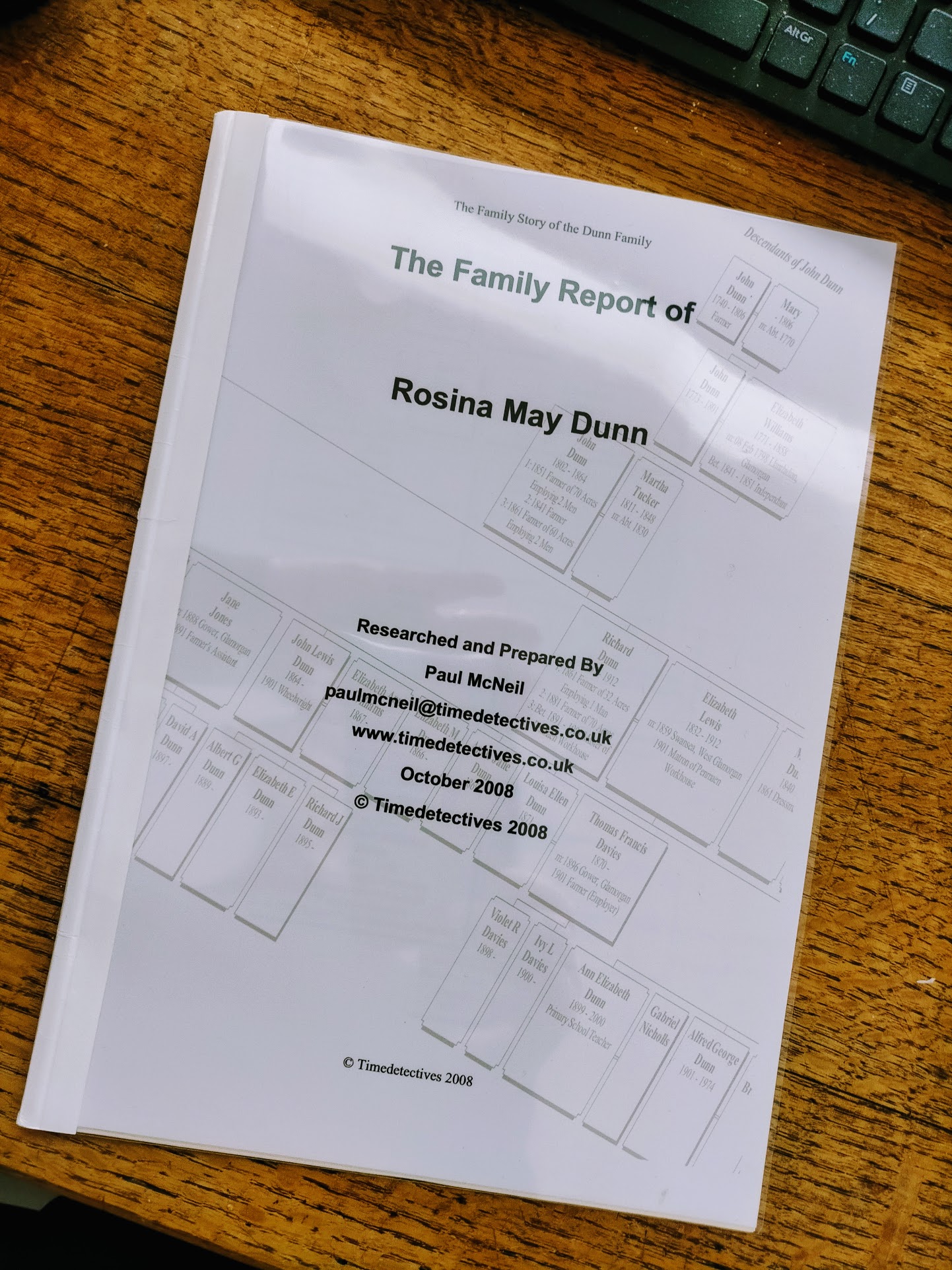 That gives an A4 sized framed tree, with a report on the basic facts we find out (usually 25-50 pages). This goes back through direct ancestors in a single surname line. It usually takes 1-2 months but depends on what is found.